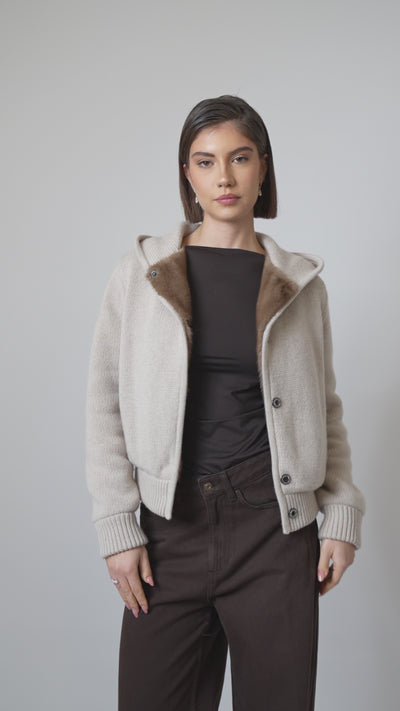 Giacca in cashmere Cariaggi con visone, chiusura con bottoni, lavorazione verticale, double face. Disponibile in altri colori.