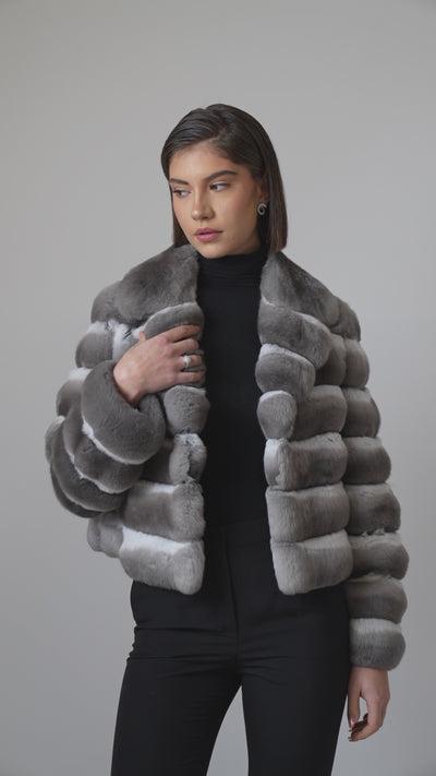 Giacca in cincilla, chiusura con ganci, lavorazione orizzontale. Disponibile anche in altri colori.