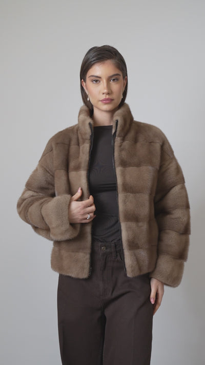Giacca in visone, chiusura con cerniera, lavorazione orizzontale, double face. Realizzabile anche in altri colori.
