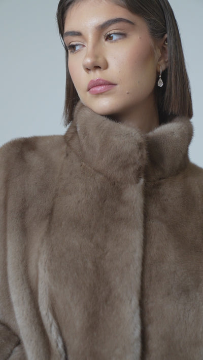 Giacca in visone, chiusura con ganci, lavorazione verticale. Disponibile anche in altri colori.